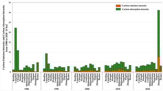 Carbon emissions intensity and carbon absorption intensity across various cities in Hebei Province from 1980 to 2020.