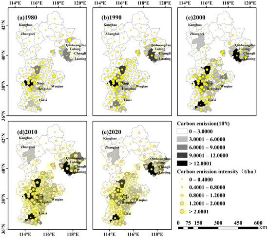 Utilizing the GIS natural breakpoint method, both the total carbon emissions and emission intensity from croplands across various counties in Hebei province were categorized into five groups, and their spatial disparities and patterns of variation were investigated (Figure 6). The carbon emissions at the county scale in Hebei province exhibit a spatial distribution characterized by higher values in the eastern and central parts and lower values in the northwest. Elevated emission levels are predominantly found in eastern counties such as Laoting and Changli, as well as in Xinji City and the jurisdiction of Hengshui City in the central part of the province. Middle-value areas are observed in cities such as Qinhuangdao and counties like Lulong in the east, as well as in counties such as Linxi and Wuqiao in the eastern and central parts. Regions with minimal regions are concentrated in the higher-altitude mountainous regions in the northwest, such as Kangbao and Zhangbei counties. In terms of spatial change patterns, the areas where the total carbon emissions decreased significantly from 1980 to 2020 are mainly distributed in Shijiazhuang and its surrounding areas, but the carbon emission intensity in this area remains relatively high. The reason is that during the rapid urbanization of Shijiazhuang, a significant amount of cropland was taken over, leading to a reduction in the area for crop planting, which resulted in inconsistent regional variations in total carbon emissions and carbon emission intensity. These regions exhibited an elevated carbon emission intensity. These regions should be identified as key areas for reducing carbon emissions from cropland. In the future agricultural production process, policymakers should provide policies supporting the development of eco-agriculture, especially in counties within the central and eastern regions where carbon emissions are relatively high.