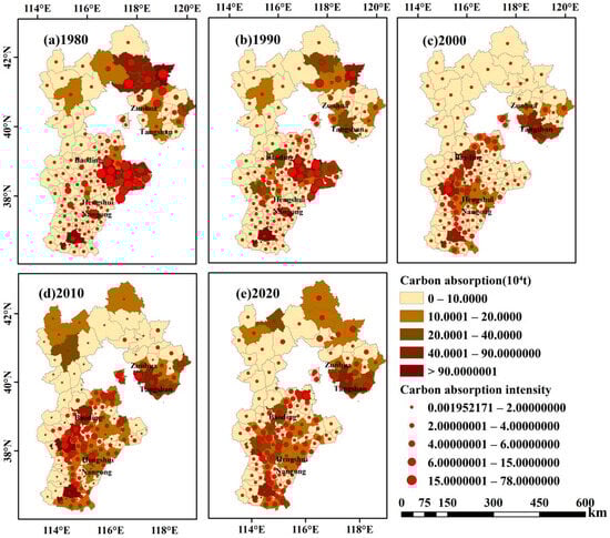 Both carbon sequestration and its intensity in Hebei Province exhibited higher values in the eastern and central parts, while lower values were observed in the western and northwestern parts (Figure 7). High-value regions were concentrated near Beijing and Tianjin, as well as in the eastern plain areas such as the urban areas of Tangshan, Zunhua, and Baoding. Regions with minimal values were predominantly located in the Taihang-Yanshan Mountains and the Bashang Plateau region. This distribution pattern was related to the area of crop planting. Due to the development of plateau characteristic ecological agriculture and the increasing crop plantings in plain areas, the total carbon absorption and carbon absorption intensity in Hebei’s counties significantly increased in the Jibei Bashang Plateau and plain areas from 1980 to 2020. Both carbon sequestration and its intensity in areas such as Nangong City and Hengshui City in central Hebei Province exhibited a “decrease–increase” trend. This pattern can be attributed to the optimization of agricultural ecological management and the adjustment of crop structures aimed at reducing excessive groundwater extraction.