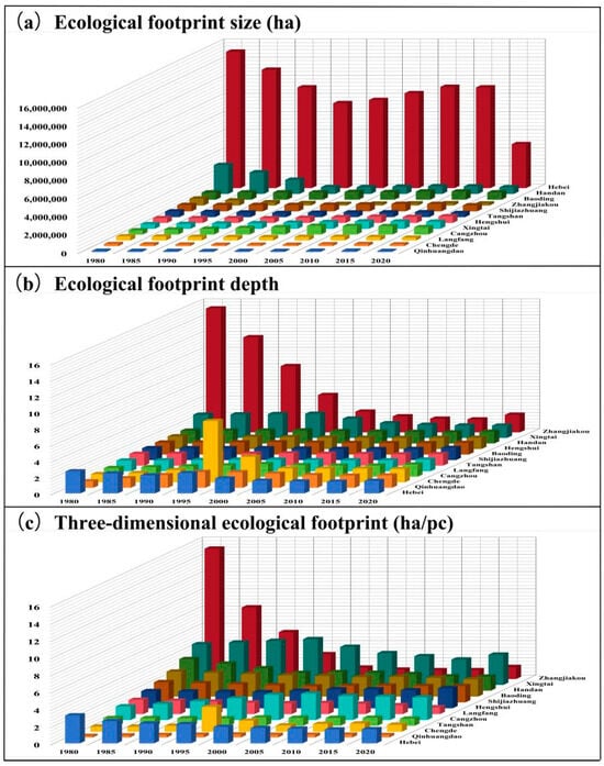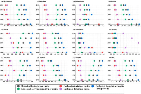 To more accurately characterize the actual occupation of cropland ecology in Hebei Province, the results are expressed in per capita values. Since 1980, the per capita cropland EF in Hebei Province and its various cities has exceeded the per capita ecological carrying capacity (EC), indicating a per capita ecological deficit. These findings show that human pressure on cropland has surpassed the EC, and the ecological environmental pressure on cropland has exceeded its load (Figure 8). From 1980 to 2020, the per capita cropland EF decreased generally, from 0.17 hm2 per person in 1980 to 0.11 hm2 per person in 2020. The most rapid decline occurred between 1980 and 1985, and from 1985 to 2020, the trend fluctuated downward. The per capita cropland EC remained relatively stable overall, with the trend in each year being similar to those of the per capita cropland EF. Although the gap between per capita EF and EC has gradually narrowed, indicating a reduction in cropland ecological deficit across Hebei Province, cropland resource conditions remain “in short supply”. The ecological deficit phenomenon continues to persist.