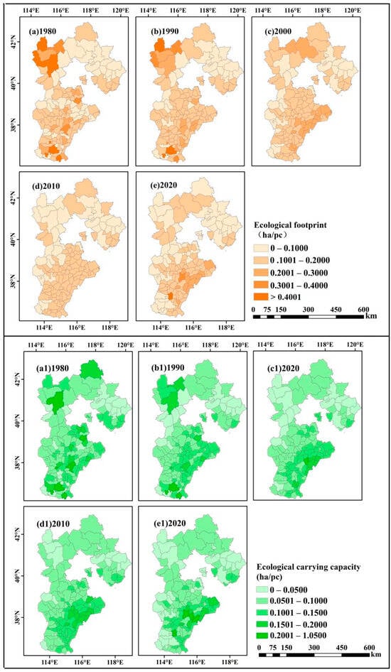 where EC represents the ecological carrying capacity; represents the per capita area for the i-th crop; and y is the yield factor. For more accurate results, we corrected the proportion of Hebei Province’s average cropland production capacity to the national average. This correction of (1–12%) was made based on the biodiversity protection area, as recommended in the World Commission on Environment and Development report.