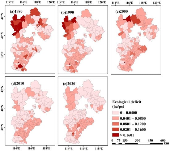 In terms of spatial pattern changes (Figure 10), between 1980 and 2020, the ecological footprint of cropland in various counties of Hebei Province exceeded the ecological carrying capacity, indicating an ecological deficit of cropland. A high pattern was observed in the northwest and southeast, with an overall decrease in the degree of ecological deficit. Urban areas in Handan and Zhangjiakou, as well as the counties of Kangbao, Shangyi, Fengning, Weichang, Ci, and Wei, exhibited a downward trend, while Huanghua City, Haixing County, Nanpi County, and Shenzhou City showed a pattern of fluctuation characterized by “increases followed by decreases and then increases”. Overall, the distribution of the per capita EF and ecological deficit of cropland across the counties was consistent, with both concentrated in the high-value areas of northwestern Hebei Province. These areas belong to ecologically fragile areas, and the impact of cropland utilization on ecological security is significant. Cropland exploitation and use have imposed significant pressure on the ecological conditions; therefore, subsequent attention should focus on the ecological pressures of cropland in this area.