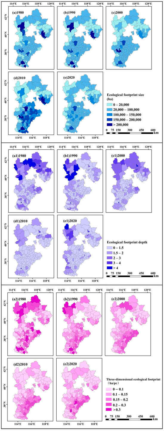 The ecological footprint (EF) model is a key tool for measuring ecological environmental impacts and sustainability [8,9,10,11], and it is highly manipulable and widely applied [12]. Through the introduction of footprint depth and breadth, this tool has undergone an evolution from one-dimensional to three-dimensional (EF3d) [6,13,14,15]. These indicators have been used to represent the human utilization of resource stock and resource flow, respectively, highlighting the scarcity and non-renewability of various resources. The model enhances spatiotemporal attributes, building upon and further developing one- and two-dimensional EF. Previous studies have precisely analyzed the ecological conditions of various lands based on the advantages of the EF3d model for comprehensive spatiotemporal analysis [1]. Meanwhile, related studies have used the EF3d model to assess regional sustainability, quantifying the evolution pattern of ecological security to guide environmental management and decision-making [7,16]. Studies on driving factors have pointed out the differential impacts of socio-economic development, population expansion, and regional policies on EF3d, providing indicators that support ecological regulation [4]. As research has deepened, the research of EF3d has been expanded. Studies have introduced a method for ecological security evaluation using an enhanced three-dimensional emergy ecological footprint, offering a new approach to ecological security assessment [12]. Furthermore, studies have developed an “open” EF3d model that differentiates between the occupation of land resources by internal and external residents in a region. They also analyze the pressure on land transferred through trade and other means [17]. Current research on the three-dimensional ecological footprint encompasses various scales [18,19], including national [20], provincial [21,22,23,24], municipal [25,26], basin [27,28], and urban agglomeration scales [29]. Integrated analysis at multiple scales can better facilitate the targeted implementation of land ecological security regulation policies that are based on regional realities.