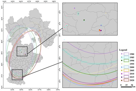 EFDepth can indicate potential threats to the long-term sustainability of cropland resources. Utilizing the center-standard deviation ellipse method [53], the spatio-temporal transfer trajectory of the per capita cropland EFdepth in Hebei Province was analyzed, enhancing the comparability of ecological environmental issues faced by cropland resources across different periods and regions. The spatial evolution process of the per capita cropland EFdepth in Hebei Province is evident (Figure 13). From 1980 to 1985, the centroid shifted 14.7 km to the southeast. This was followed by a movement of 18.6 km from 1985 to 1990, 49.4 km to the northeast from 1990 to 1995, 35.7 km to the southwest from 1995 to 2000, and an additional 14.6 km to the southwest from 2000 to 2005. The offset distance has significantly decreased since 2005, indicating that the initial changes in the per capita cropland EFdepth were more pronounced than the subsequent ones. Between 1990 and 2000, both the transfer distance and the major and minor axes of the standard ellipse for the center shift decreased significantly, indicating that counties with higher concentrations of the per capita cropland EFdepth in the eastern part of Hebei Province were more prominent. This trend can primarily be attributed to accelerated economic development, dense population concentrations, and urban expansion encroaching upon cropland, leading to a substantial reduction in cropland. Overall, from 2005 to 2020, the changes in the transfer distance of the center and the major and minor axes of the standard deviation ellipse were not significant, indicating that the per capita cropland EFdepth in Hebei Province has maintained relatively stable spatial characteristics. From 1980 to 2000, the centers of the per capita cropland EFdepth were in Yi County, Baoding City, Baoding City, Rongcheng County, and Anxin County. However, from 2005 to 2020, the focus shifted to Gaoyang County, which has now become a key area for cropland ecological security regulation.