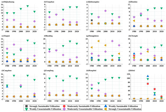 The study of the ecological footprint reflects the ecological deficit of cropland in Hebei Province. To visually represent the sustainable use levels of cropland across various counties in Hebei Province, a sustainable use index was employed to categorize the sustainable use status of cropland in the region. From the perspective of provincial regions, cropland has consistently been in an unsustainable state from 1980 to 2020; however, there has been a reduction in its unsustainable capacity.