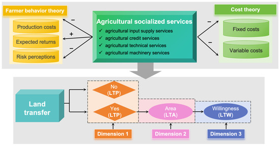 From a cost theory perspective, land transfers involve multiple expenses, comprising fixed (e.g., contract signing and land preparation fees) and variable costs (e.g., labor and agricultural inputs) [21]. Agricultural socialized services (ASSs) primarily influence land transfers by altering the structure and magnitude of these costs. First, ASSs help to reduce fixed costs associated with land transfers. ASSs, for example, provide intermediary services for land transfers by leveraging extensive land resource databases and professional contract drafting expertise. These services streamline preparatory work at lower costs, thereby lowering fixed expenses for farmers. Second, ASSs exert a more pronounced impact on variable costs. Mechanized farming services reduce reliance on labor, cutting labor costs, while bulk purchasing of agricultural inputs and precision fertilization/pesticide services lower material expenses [22,23]. The reduction in variable costs enhances post-transfer profitability, making farmers more willing to engage in land transfers and expand their scale. Finally, from a long-term cost–benefit perspective, ASSs foster economies of scale in land transfers by improving land use efficiency and agricultural productivity. As transfer scales reach optimal levels, per-unit production costs decline while output increases, creating a self-reinforcing cycle that further incentivizes land transfers. The analysis framework is depicted in Figure 1.