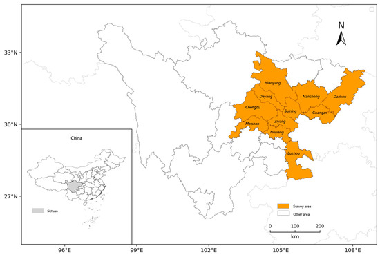 This study is based on data collected through a random sampling survey of rice farmers in Sichuan Province between July and October 2020. A stratified random sampling method was employed to ensure the sample’s representativeness and diversity. Initially, 11 major rice-producing cities in Sichuan Province were selected, including Chengdu, Deyang, Mianyang, Ziyang, Meishan, Suining, Neijiang, Nanchong, Dazhou, Guang’an, and Luzhou (Figure 2). Within each city, two county-level administrative districts were randomly chosen, followed by the selection of 2–3 towns per county. Finally, 10–20 rice-farming households from each town were interviewed through face-to-face questionnaires, resulting in a dataset of 858 valid samples. These samples encompass diverse geographical, economic, and social contexts, providing a robust empirical foundation for this study.