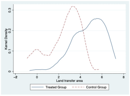 Table 2 presents a detailed comparison of the average differences between farmers who have adopted ASS and those who have not. An analysis of the mean differences reveals that there are statistically significant disparities between the two groups of farmers on most variables, indicating that there are indeed systematic differences between those who have adopted the services and those who have not. Specifically, the adoption group exhibits significantly higher rates in key indicators such as LTP, LTA, and LTW compared to the non-adoption group. These differences preliminarily uncover the potential pivotal role that ASSs may play in farmers’ land transfer decisions. The LTA is higher for non-participants. However, at higher levels, participants (ASS) tend to transfer more land (see Figure 3).