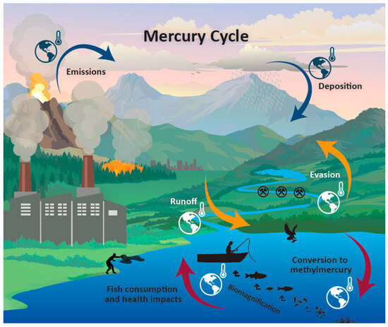 As land temperatures increase, landlocked freshwater systems will also see increased temperatures. Extended periods of warm temperatures in lakes increased Hg methylation and decreased demethylation rates [40]. Anoxic waters and sediments promote the methylation of Hg, usually via sulfate-reducing microorganisms [41]. Increases in water temperatures generally decreased mixing, increased stratification, or raised the thermocline, increasing the area of anoxic environments in lakes, which leads to increased MeHg production [42].
