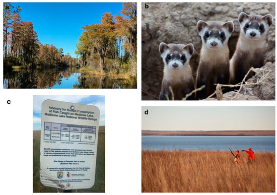 The U.S. National Wildlife Refuge System (NWRS) is the largest network of protected lands and waters dedicated to conserving fish, wildlife, and their habitats. Spanning diverse ecosystems across North America, many NWRS units (e.g., refuges) also include federally designated wilderness areas, such as Georgia’s Okefenokee National Wildlife Refuge (a). Refuges support rich biodiversity and provide critical habitat for imperiled species like the endangered black-footed ferret (Mustela nigripes); (b). Despite their protected status, these ecosystems remain vulnerable to airborne and waterborne pollutants, with some refuges posting associated warnings (c). This has important implications for human health, as many refuges are popular for hunting and fishing, such as Kirwin National Wildlife Refuge in Kansas (d), underscoring the need for a One Health approach to conservation. Photo credits: (a,c) = Jennifer Wilkening, USFWS, (b) = Kimberly Fraser, USFWS, (d) = USFWS.