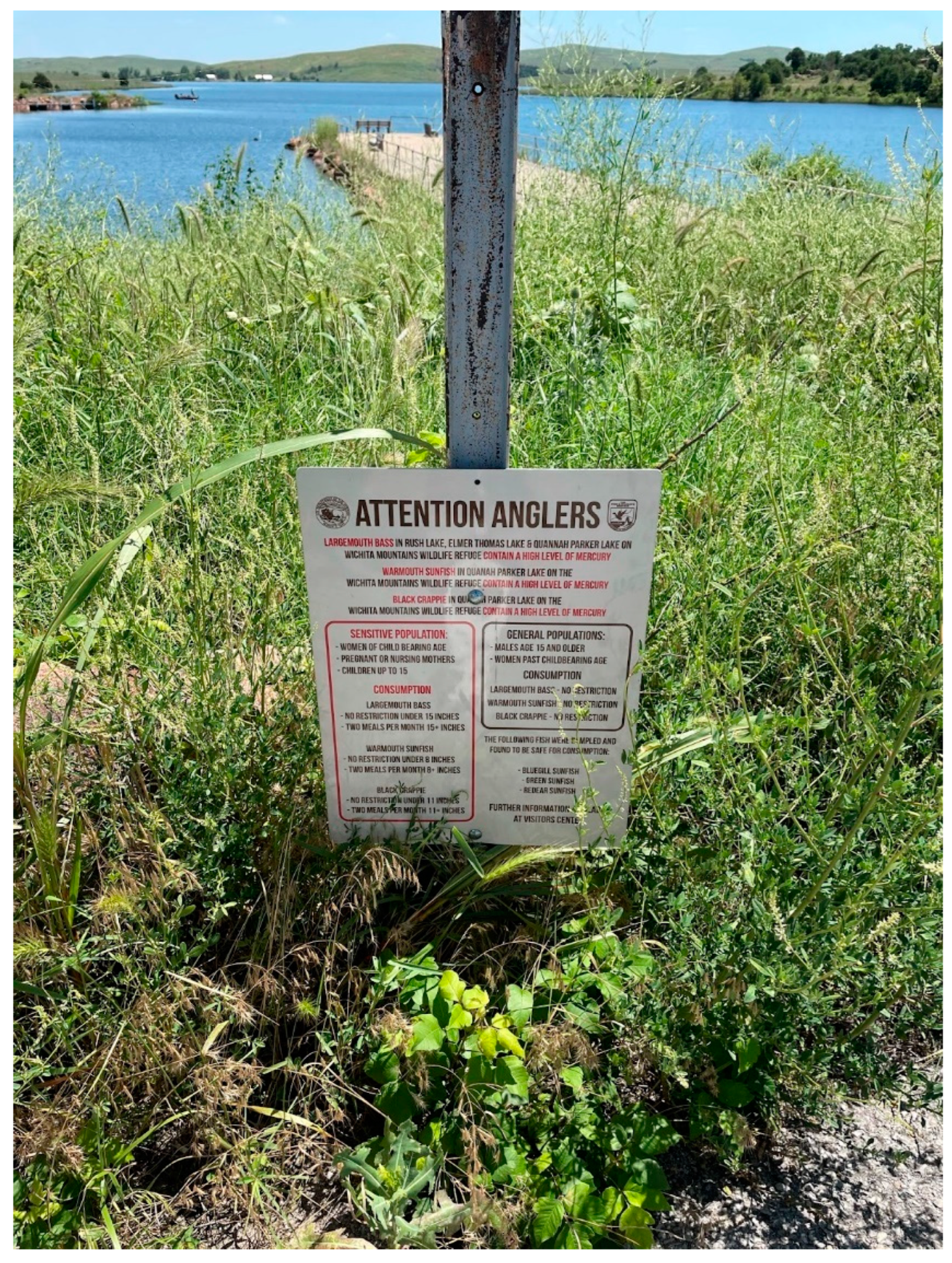 Wildlife managers regularly engage with local hunters and anglers and can leverage these relationships to ask about the observed health and behavior of individuals, especially high trophic level predators that primarily feed in aquatic systems [136]. Additionally, wildlife managers can continue advising hunters and anglers on mercury levels to help prevent human exposure to Hg. Mercury advisory signage and outreach are commonly found near bodies of water that may expose fish-consumers to MeHg by consuming contaminated fish species (Figure 4). Assessing the effectiveness of these outreach efforts is paramount as we invest time and resources in public health education and prevention. Such studies have found, however, that Hg advisories can fall short of reaching their intended audience or desired goal [137,138,139]. Further, these advisories often focus on the impacts of MeHg exposure on human health and rarely speak to the health of wildlife itself.