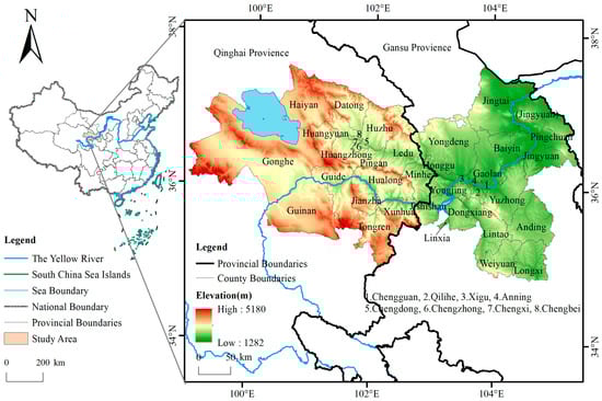LXUA is located at 98°05′ E–105°38′ E, 34°07′ N–39°05′ N, containing 20 county-level units in Gansu Province and 19 county-level units in Qinghai Province, with an overall of 39 counties (county-level cities and districts) (Figure 1), a gross area of 9.75 × 104 km2 accounting for 8.3% of the total area of the Gansu and Qinghai provinces, a gross population of 1346 × 104 people, accounting for 66.5% of the total population of the Gansu and Qinghai provinces, and a gross GDP of 6139.14 × 108 yuan, accounting for 51% of the total GDP of the Gansu and Qinghai provinces in 2022. Located in the upper reaches of the Yellow River, LXUA is a prominent growth pole for the socioeconomic development of Northwest China and plays a prominent supporting role in promoting the prosperity and stabilization of Northwest China. With the Lanzhou–Chongqing railway in operation, the Xining–Chengdu railway started, and the new western land and sea dual composite corridor construction, the LXUA has become the new Asia–Europe Land Bridge corridor and the new western land and sea corridor the intersection of the double cross-hub. The LXUA is expected to become a hub region of China’s new development pattern based on domestic macro-circulation and the mutual promotion of the domestic and international double-circulation, a key region for the construction of a national strategic hinterland, a key industrial backup, a receiving region for the transfer of industries from East and Central China to the West, and a model region for innovation-driven leadership and transformation of the old and new kinetic energies.