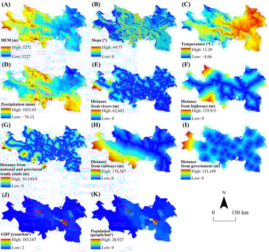 Driving factors. (A) DEM, (B) Slope, (C) Temperature, (D) Precipitation, (E) Distance from rivers, (F) Distance from highways, (G) Distance from national and provincial trunk roads, (H) Distance from railways, (I) Distance from government, (J) GDP, and (K) Population.