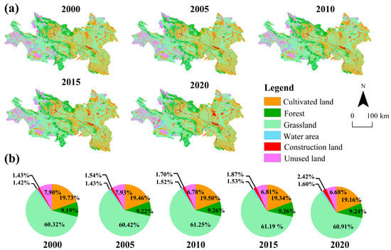 Land use in the LXUA from 2000 to 2020. (a) Spatial distribution of land use. (b) Proportion of land use type area.