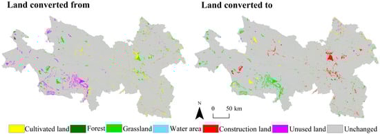 where represents the area of land type i that has been converted to land type j. The term n represents the number of land use types before and after the transfer. The terms i and j (where i,j = 1, 2,⋯,n) correspond to the specific land use types before and after the conversion, respectively.