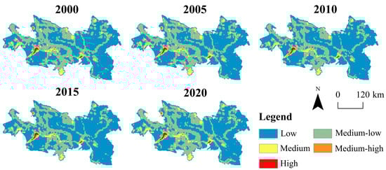 Based on the spatial visualization of ESVs in ArcGIS 10.8, ESVs were classified into five levels: high, medium-high, medium, medium-low, and low, according to the natural breakpoint method. The features of the spatial distribution of ESVs of each class in the LXUA in the period of 2000–2020 were presented on the map from high to low and showed in five classes of red, orange-red, yellow, earthy yellow, and blue, respectively (Figure 5). There are few high value areas for ES, and the spatial pattern is distributed in a belt-like manner, mainly in large reservoirs such as the Longyangxia Reservoir in the junction of Gonghe County and Guide County of Qinghai Province and the Liujiaxia Reservoir in Yongjing County of Gansu Province, as well as in the northeastern edge of the Qinghai Lake, which includes the territory of Haiyan County. There are fewer medium-high value areas for ES, similar to the distribution of broad waters area along the Yellow River, with a point-like spatial pattern, mainly in counties such as Gonghe, Haiyan, Datong, and Guide in Qinghai Province. There is an average number of medium-value areas for ES, similar to the distribution of FL, with an island-like spatial pattern, mainly distributed on the border between Jianzha County and Hualong County and the broad waters area along the Yellow River in Guide County, Qinghai Province, in addition to the original forests in Xinglong Mountain, which is the border between Yuzhong County and Lintao County. There are many medium-low value areas for ES, similar to the distribution of GL, and the spatial pattern is mostly distributed in the form of corridors, primarily in counties or cities such as Gonghe, Haiyan, Datong, Guide, and Tongren in Qinghai Province and less prominently in counties or districts such as Yongdeng, Gaolan, Yuzhong, Jingyuan, Dongxiang, Lintao, Weiyuan, Longxi, and Pingchuan in Gansu Province. They are more low-value areas for ES are concentrated in cities such as Lanzhou, Xining, Haidong, and most of Baiyin, and four counties in the northern of Dingxi; the spatial pattern is mostly patchy, similar to the distribution of CSL and CL.