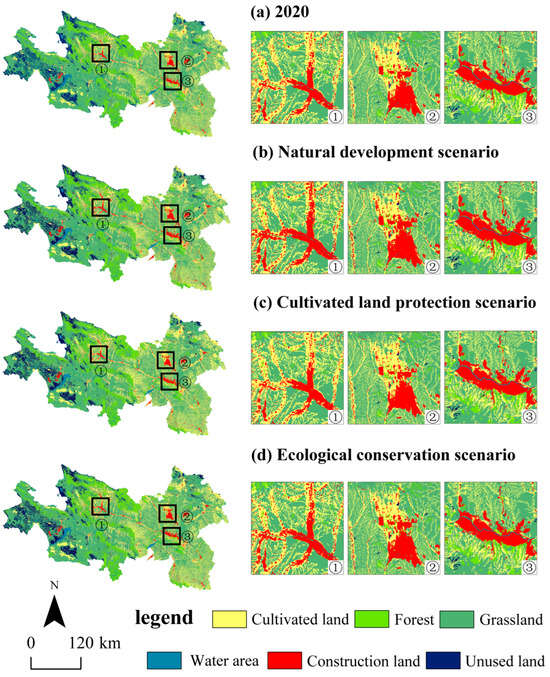 Results of land use in 2020 and multi-scenario simulations in 2030. (a) Land use in 2020, (b) Land use under the NDS, (c) Land use under the CLPS, and (d) Land use under the ECS. Note: ①, ②, and ③ represent Xining City, the Lanzhou New Area, and Lanzhou City, respectively.