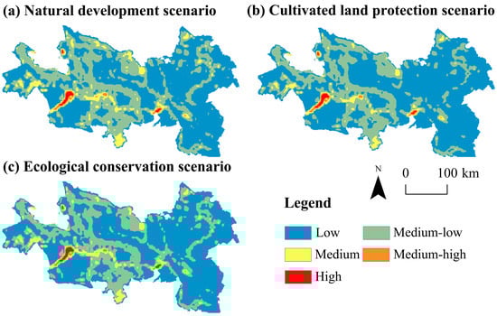 According to the simulation land use pattern of the LXUA in 2030, ESVs were assessed under the NDS, the CLPS, and the ECS (Table 8). Spatial visualizations of ESVs were carried out based on the natural breakpoint method of ArcGIS 10.8, which classified ESVs into five levels of high, medium-high, medium, medium-low, and low (Figure 7). Under the three scenarios, ESVs were 2183.89 × 108 yuan, 2148.46 × 108 yuan, and 2211.06 × 108 yuan, respectively. Only the ESV under the ECS increased compared with that of 2020. The ESVs of the other two scenarios declined, and the ESV under the CLPS had the greatest loss. Relative to 2020, the changes in ESV of each type of land under the three scenarios in 2030 are as follows: