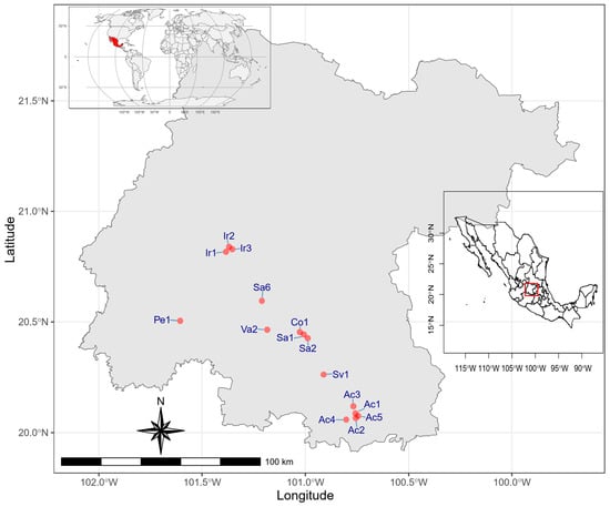 Sampled sites (red dots); red box, state of Guanajuato, and red shading, country Mexico.