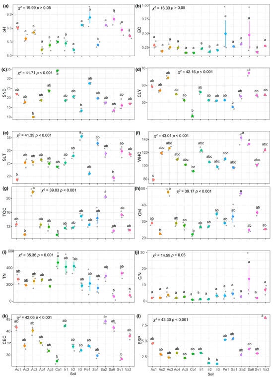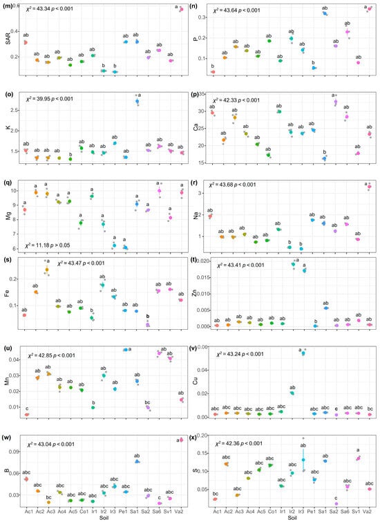 As a result of the Shapiro normality test, it was concluded that the soil indicator data did not have a normal distribution. Therefore, nonparametric statistical tests were performed. The Kruskal–Wallis test applied to the indicators revealed that there were no significant differences among soils regarding their pH, EC, C/N, and Mg indicators (Figure 2a,b,j,u, respectively). However, for the other indicators, the analysis divided the soils into at least two distinct groups (Figure 2).