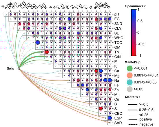 Spearman correlation matrix with the Mantel test for analyzed indicators of sampled soils. Blue circle, positive correlation, red circle, and negative correlation. Large circle correlation close to 1, small circle no correlation. Significance of the Mantel test, gray color no significance, blue, orange and green color, significance under , and respectively, wide line, continuous and discontinuous positive and negative correlation, respectively, thin line no correlation. *, significant value at ; **, significant value at ; ***, significant value at . The meaning of acronyms are described in Table 2.