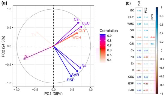 Figure 4a,b displays that the soil indicators are significantly correlated with their PCs) CLY, WHC, Ca, Na, and CEC were positively correlated with PC1, whereas S showed a negative correlation . In contrast, PC2 was negatively correlated with ESP and SAR, while PC3 only correlated negatively with the C/N ratio.