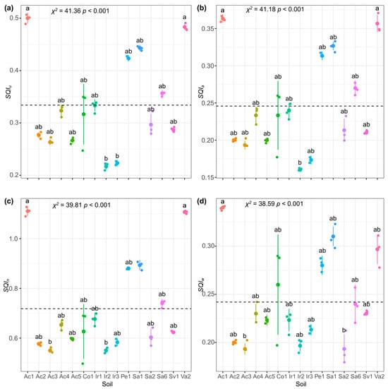 Kruskal–Wallis analysis for sampled soil quality results with subsequent Dunnett’s test of medians with Bonferroni adjustment at significance level . (a) SQIu, the unified weighted index; (b) SQIa, the additive index; (c) SQIn, the Nemoro index; (d) SQIw, the weighted index. Large colored dot means mean value of the measurement; bars indicate SD (n = 3). Black dotted line means mean value of soil quality for all soils. Same letters indicate that there is no significant difference between treatments using a Kruskal–Wallis analysis with subsequent Dunnett’s median test with Bonferroni adjustment at a significance level .