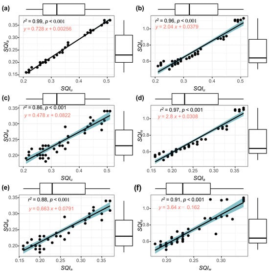 (a–f) Correlation analysis between the various developed. , unified soil quality index; , additive soil quality index; , weighted soil quality index; , Nemoro soil quality index; p, probability value; , correlation coefficient. Blue area refers to standard deviation with 95% confidence interval.