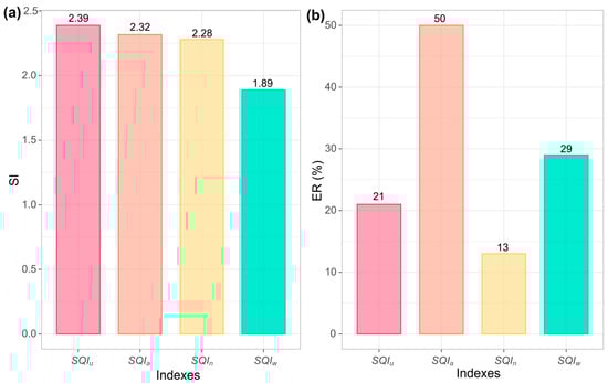 (a) SI, sensitivity index and (b) ER, efficiency ratio of developed SQIs. , unified soil quality index; , additive soil quality index; , weighted soil quality index; , Nemoro soil quality index.