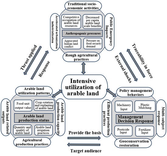 With the rapid development of the global economy and the deepening urbanization in various countries, the abuse of arable land resources has become increasingly prevalent, exacerbating the trend of non-agricultural conversion of farmland and intensifying the scarcity of arable land. To optimize land use patterns and enhance the quality of per-unit grain production, intensive land utilization—characterized by the strategic allocation of capital, labor, and technological inputs to maximize economic returns—has emerged as a critical strategy for ensuring food availability and maintaining global food security. Nevertheless, global public emergencies marked by uncertainty and urgency have exerted bidirectional pressures on the supply-demand equilibria of food, inducing multifaceted impacts on socioeconomic systems and the intensive utilization of arable land. Public emergencies refer to sudden, unpredictable emergency events that pose significant threats or have severe impacts on public interests, public safety, or social order. Key characteristics of such emergencies include suddenness, urgency, uncertainty, and extensive social ramifications. These events often have multidimensional impacts on the economic and social systems through complex mechanisms such as supply chain disruptions, resource allocation shifts, or policy adjustments, which in turn affect the stability and sustainability of specific domains, including the intensive use of arable land [1,2,3]. In 2020, the Committee on World Food Security (CFS) released a thematic report, The Impact of Coronavirus Disease 19 (COVID-19) on Food Security and Nutrition, highlighting that the COVID-19 pandemic, as a major sudden public emergency, disrupted global food production systems through multifaceted, dynamic effects and posed significant threats to food supply chain resilience. Evidently, compounded by such public events, escalating pressures on food production have amplified external stressors on intensive arable land utilization while altering its operational states and necessitating adaptive responses. In this case, how to scientifically evaluate the level of intensive arable land utilization and its pressure-state response (PSR) dynamics has become a critical research topic.