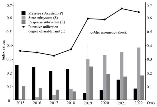 Under the impact of public emergencies, maintaining intensive arable land utilization has become a global imperative. This study constructs a comprehensive analytical framework based on the pressure-state response (PSR) model to systematically evaluate the pressure, state, and response subsystems underlying the intensive arable land utilization in Sichuan Province from 2015 to 2022. By incorporating not only land use dynamics but also socioeconomic contexts and external interventions—particularly the shocks of public emergencies—the research transcends the limitations of traditional studies focusing on economic and social factors, offering a novel perspective on the analysis of the dynamic evolution of intensive land utilization. The main findings are as follows: