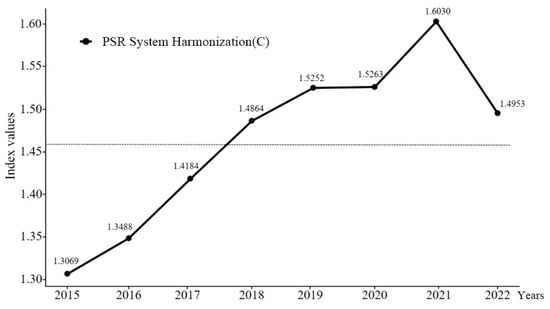 Coordinated degree values and temporal trends of the PSR System in Sichuan Province from 2015 to 2022.