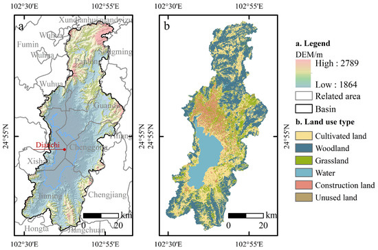 The Dianchi basin is located in southwestern China (Figure 1), where the sixth-largest freshwater lake, known as the Pearl of the Chinese Plateau, is situated [31]. The basin is narrow in the north and south, and broad in the east and west, surrounded by mountains [32]. The geographic location of the basin is between 24°28′~25°27′ N and 102°29′~103°00′ E. The altitude ranges from 1864 to 2789 m, and the terrain is rich in geomorphology. The natural conditions are relatively complex. Cultivated land and woodland are the main land use types in the region, and the distribution of construction land is relatively concentrated, mainly in the junction of Wuhua District, Panlong District, Guandu District, and Xishan District. Although the abundant water resources and vegetation give the region a relatively low ecological risk value, the basin has a total population exceeding 4.06 million, which accounts for approximately 64% of the population of Kunming. Moreover, with the increasing intensity of human activities in recent years, the ecological risk in certain areas has significantly increased, creating challenges for the protection of its ecological environment. Therefore, identifying ecological defense zones within the Dianchi basin and evaluating the effects of land use alterations on ecological risk are of considerable importance for research.