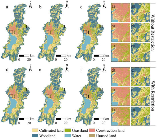 Land use patterns under multiple scenarios in the Dianchi basin for 2030. Note: (a–f) represent NS, ES, PS, NS (with restricted zone), ES (with restricted zone), and PS (with restricted zone), respectively, and I and II are localized detail comparisons.