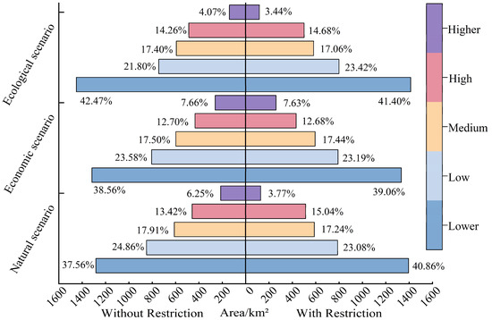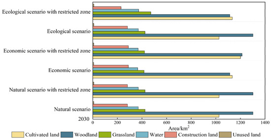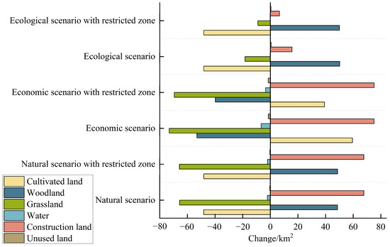 As shown in Figure 5, under the NS, the area of water increased slightly, transforming from grassland after the addition of the ecological defense zone, while the rest of the land categories remained unchanged. In the ES, after the inclusion of the ecological defense zone, the area of woodland exceeded that of cultivated land and became the most extensive. Accordingly, the area of natural landscapes, such as grassland and water, increased slightly, while the area of cultivated land decreased. In the PS, after incorporating the ecological defense zone, the area of woodland and grassland increased significantly, while the area of construction land decreased significantly. Overall, in the ES, the difference in the area of cultivated land and woodland was not significant. The rest of the scenarios showed that the area of woodland was the largest, followed by cultivated land, grassland, water, construction land, and unused land. The area of construction land was the highest under the ES, at 289.32 km2, and the lowest under the PS, at 220.82 km2. In short, the land use distribution was influenced by the ecological defense zone. Extracting the zone as a restricted conversion zone effectively inhibited the erosion of natural landscapes by man-made landscapes. Compared with the multi-scenario simulation, the introduction of the ecological defense zone optimized land use allocation and provided a feasible solution to alleviate the conflict between land protection and human development.