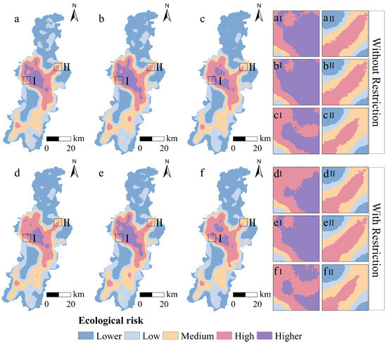Ecological risk evaluation under multiple scenarios for Dianchi basin for 2030. Note: (a–f) represent NS, ES, PS, NS (with restricted zone), ES (with restricted zone), and PS (with restricted zone), respectively, and I and II are localized detail comparisons.