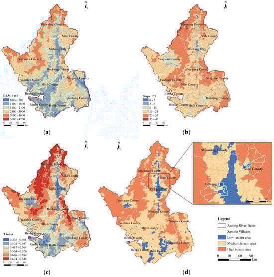 This is a hierarchical spatial map of topographic factors such as elevation, slope, and terrain position index. (a) Terrain classification map of DEM; (b) terrain classification map of slope; (c) terrain classification map of terrain position index; (d) location map of sample villages with different terrain gradients (Source: Study findings).