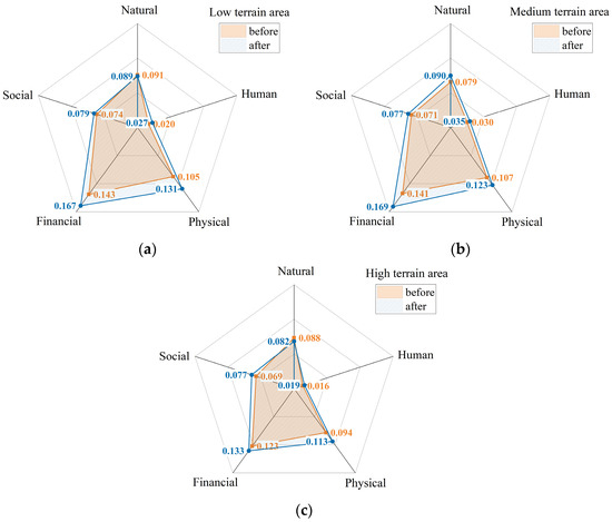 This is a radar chart of farmers’ livelihood capital before and after comprehensive land consolidation under different terrain gradients. (a) Radar map of farmers’ livelihood capital under low-terrain gradients; (b) radar map of farmers’ livelihood capital under medium-terrain gradients; (c) radar map of farmers’ livelihood capital under high-terrain gradients (Source: Study findings).
