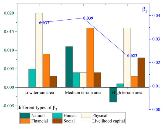 In terms of individual livelihood capitals (Figure 4), natural capital increased in the medium-terrain area, while the low- and high-terrain areas exhibited a tendency for natural capital outflow, primarily due to an increased willingness among some farmers to transfer land and the reversion of land to state ownership by relocated households. After CLC, the ranking of the material capital index was low-terrain area > medium-terrain area > high-terrain area, which is related to the spillover effects of urban infrastructure on farmers in the low-terrain area. The financial capital index was relatively high and showed significant growth, indicating that it is crucial for farmers’ livelihoods. The human capital and social capital of farmers in different terrain areas have both improved.