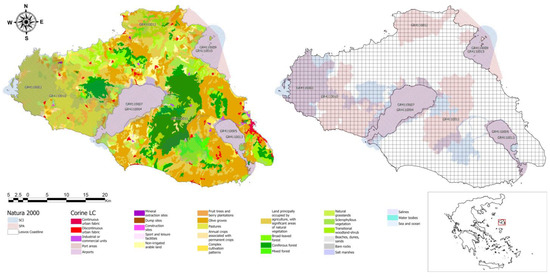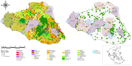 Distribution map of the mainland habitats across the island of Lesvos. The island is divided into a 1 × 1 km grid to facilitate field surveys. Key geographical features, including Natura 2000 sites, are highlighted. The inset map shows the location of Lesvos within Greece (red frame).
