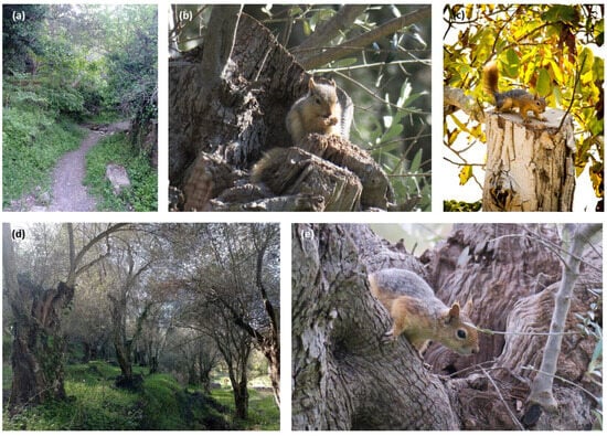 Habitat and activity of the Persian squirrel (Sciurus anomalus) on Lesvos Island, Greece: (a) a natural pathway within the study area; (b) an individual feeding on an olive tree; (c) a squirrel navigating a common walnut tree; (d) a dense olive grove characteristic of the species’ habitat; (e) a Persian squirrel in an alert posture within an olive tree cavity.