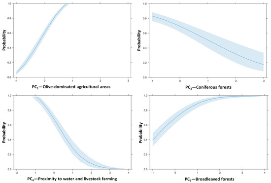 The PCA identified five significant components with eigenvalues exceeding 1.0, collectively explaining 81.46% of the total variance in the dataset (Table 1). PC1—Olive-dominated agricultural areas (eigenvalue = 2.724, variance = 22.70%) was characterized by high loadings for actively cultivated olive groves (0.920), total cultivated land (0.908), olive tree cover density (0.655), and vegetation productivity (0.624). PC2—Chestnut forests (eigenvalue = 2.091, variance explained = 17.42%) was associated with chestnut plantations (0.977) and chestnut tree cover density (0.976). PC3—Coniferous forests (eigenvalue = 1.780, variance explained = 14.84%) was defined by coniferous tree cover density (0.913) and coniferous forest extent (0.863). PC4—Proximity to water and livestock farming (eigenvalue = 1.597, variance explained = 13.31%) was primarily associated with proximity to livestock facilities (0.863) and proximity to water sources (0.801). PC5—Broadleaved forests (eigenvalue = 1.583, variance explained = 13.19%) was characterized by broadleaf tree cover density (0.871) and broadleaved forest extent (0.777).