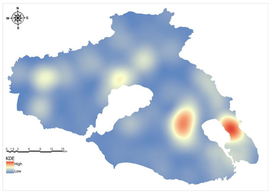 The KDE analysis identified multiple high-density areas, with the most pronounced aggregations occurring in the southeastern and eastern regions of the island (Figure 5). These areas primarily correspond to landscapes dominated by olive groves and mixed agricultural land. Lower-density regions, characterized by sparse or isolated occurrences, were predominantly found in the northern and southwestern parts of the island, where more fragmented forest patches and steeper terrain prevail.