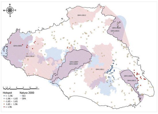 Hotspots (95% confidence level) were identified at 28 locations (mean z-score = 3.03, SD = 0.53) and encompassed a total of 78 records. These clusters were primarily concentrated in the eastern and western parts of the island, with nineteen occurring in the eastern region, four of which overlapped with Natura 2000 sites, and nine in the western region, all of which were within protected areas. Intermediate hotspots (90% confidence level) were recorded at seven locations, containing 15 records with a mean z-score of 1.77 (SD = 0.05). These clusters were distributed across different parts of the island, with one occurring in the north, one in the west, and four in the central region, with six of the seven located within Natura 2000 sites.