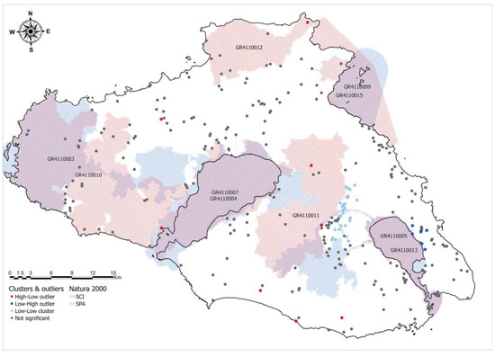 Low–High (LH) outliers, signifying low presence values occurring within high-density regions, were the least frequently observed pattern. A total of six LH outliers were recorded, accounting for six presence points, with three of these falling within Natura 2000 sites in the eastern part of the island. The z-scores for LH outliers ranged from −6.97 to −3.44 (mean = −4.99, SD = 1.33), indicating isolated low-density occurrences embedded within areas of high S. anomalus presence.