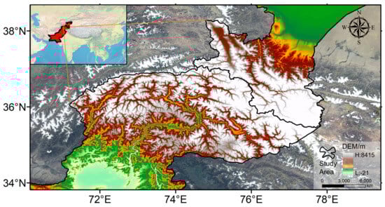 The CPEC spans the Xinjiang Uyghur Autonomous Region in China and the entire territory of Pakistan, stretching from Kashgar in northern Xinjiang to Gwadar Port in southwestern Pakistan (Figure 1) [43]. Based on the actual distribution of the corridor and relevant studies, this research focuses on the PP section (33–38° N, 71–78° E) as the study area, which is characteristic of an arid, high-mountain ecosystem [44,45]. The region’s high elevation and complex, variable climate make it one of the areas most significantly affected by global climate change, thereby holding considerable value for studies on ecology, climate, and water resources. The PP is a key component of the “Asian Water Tower” and nurtures the largest endorheic river in Central Asia—the Amu Darya—and its major tributaries [46,47]. Situated in the upper reaches of the Amu Darya and deep inland, the area experiences a strongly continental climate, with sparse precipitation on the plains and runoff primarily sustained by mountain precipitation and glacial meltwater [48,49]. Mountain glaciers on the PP cover an area exceeding 10,000 km2, with large-scale glaciers mainly concentrated around the Somoni Peak–Lenin Peak region in the northwest and the Mustagh–Kongur Peak area in the southeast, while other mountainous regions are dominated by smaller glaciers [50].