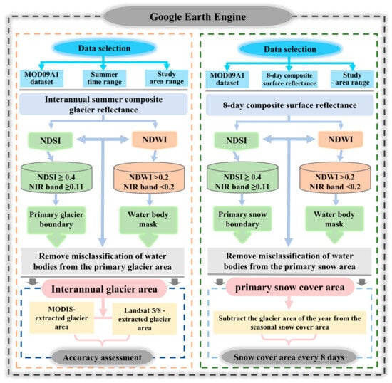 For snow cover extraction, this study utilized the MODIS 8-day composite surface reflectance data to compute the normalized difference snow index (NDSI) and extract seasonal snow cover areas [60]. The snow cover extraction method is similar to that for glaciers: MODIS bands 4 and 6 were used to calculate the NDSI, and pixels were selected based on a combination of NDSI ≥ 0.4 and band 2 > 0.11 to obtain the preliminary seasonal snow cover area [61]. To further reduce the misclassification of water pixels, a water mask was generated using NDWI > 0.2 and band 2 < 0.2, and this mask was used to eliminate water pixel influence from the preliminary seasonal snow cover area [60]. Finally, pixels overlapping with the summer glacier area of the same year were removed to ensure that the extracted area accurately reflects the rapidly changing seasonal snow regions. The detailed operational workflow is shown in Figure 2.