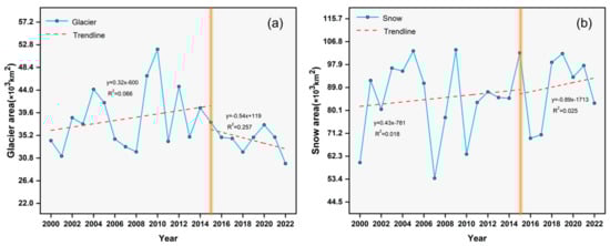 Temporal variation trends in glacier and snow cover areas in the PP section of the CPEC before and after its launch from 2000 to 2022. (a) Represents the temporal trend of glaciers, and (b) represents the temporal trend of snow cover.