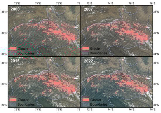 In terms of spatial distribution, from 2000 to 2022 the trend of glacier retreat in the PP section gradually became evident, with notable differences in the degree of retreat among different regions (Figure 4). In 2000, glaciers were widely distributed in high-mountain areas, almost covering most of the region and showing a relatively stable distribution pattern. However, as time progressed, glacier areas gradually diminished, with the retreat becoming especially pronounced in 2007, 2015, and 2022. During these years, glacier areas progressively shrank, particularly in the eastern and southern regions of the PP where glaciers nearly completely degraded, clearly reflecting the impact of climate change. By 2022, the retreat had reached its peak, with significant glacier recession observed in almost all regions. Glacier distribution became noticeably concentrated in high-mountain areas, while glaciers in low-altitude regions almost disappeared. These changes indicate that global warming has had a profound impact on glaciers in the PP section, with the retreat intensifying both temporally and spatially, especially in certain areas. Such changes reflect the far-reaching influence of climate change on glacier distribution in the PP and provide important evidence for further research on water resource variations, ecological impacts, and regional climate change.