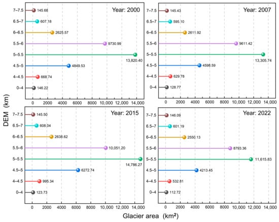 In terms of temporal changes, the glacier areas at different elevations in the PP section of the CPEC in 2000, 2007, 2015, and 2022 show significant differences (Figure 6). Glaciers are primarily distributed within an elevation range of 4500 to 6500 m. Among these, the 5 to 5.5 km elevation band exhibits the largest glacier area, followed by the 5.5 to 6 km and 4.5 to 5 km bands, while the glacier area above 7.5 km is the smallest. Compared with 2000, the glacier area in the 5 to 5.5 km elevation band decreased from 138.20 × 102 km2 to 116.16 × 102 km2 by 2022, with a total reduction of 2204 km2 and an average annual decrease of approximately 95.83 km2. In the 5.5 to 6 km band, the glacier area declined from 97.31 × 102 km2 to 87.93 × 102 km2, with a total loss of 938 km2 and an average annual decrease of about 40.78 km2. In the 4.5 to 5 km elevation band, the glacier area decreased from 48.50 × 102 km2 in 2000 to 42.13 × 102 km2 in 2022, with a total reduction of 636 km2 and an average annual decrease of approximately 27.65 km2. In contrast, changes in other elevation bands over the past two decades were relatively minor. Notably, in the 7 to 7.5 km elevation band, the glacier area slightly increased from 145.68 km2 to 146.09 km2, with a total increase of only 0.41 km2 and an average annual growth rate of 0.02 km2.